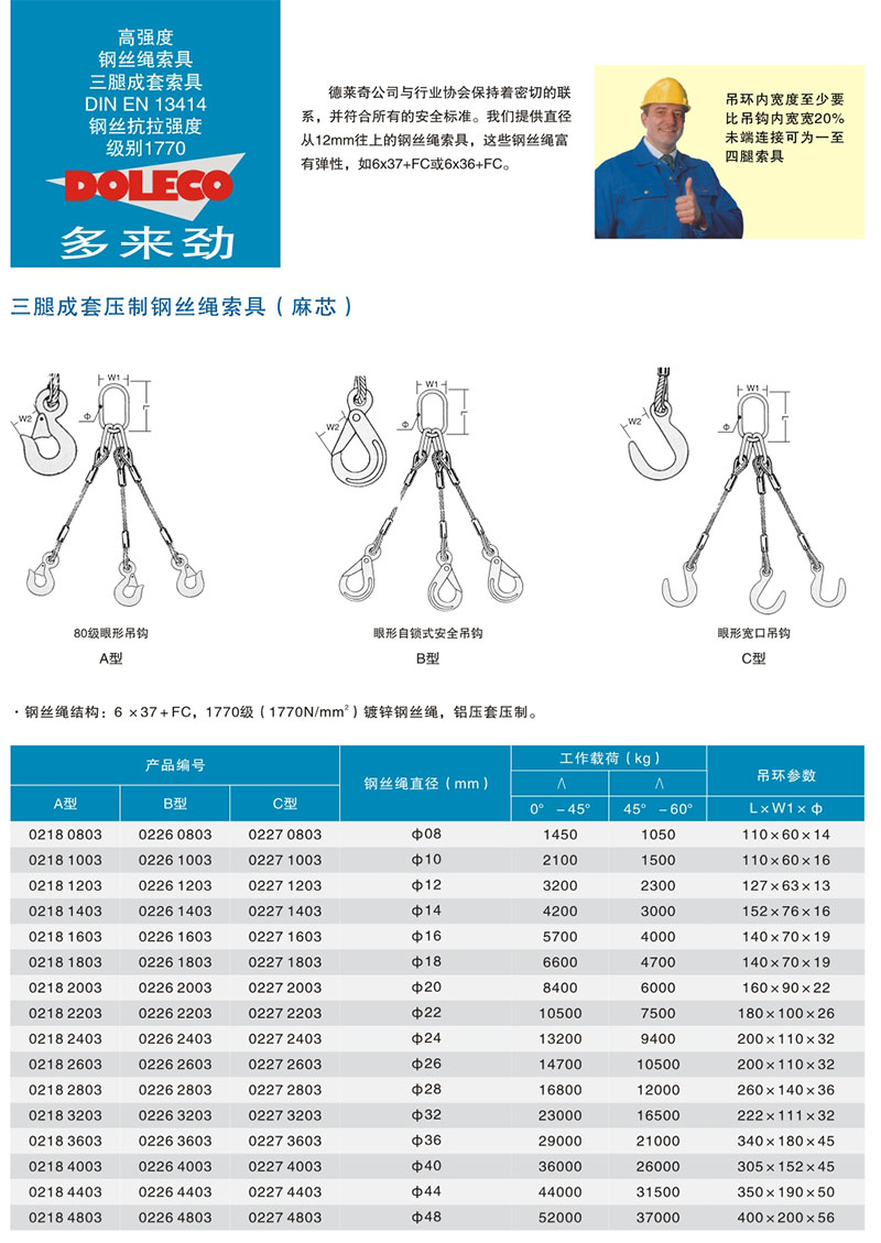 DOLECO三腿成套壓制鋼絲繩索具(麻芯)